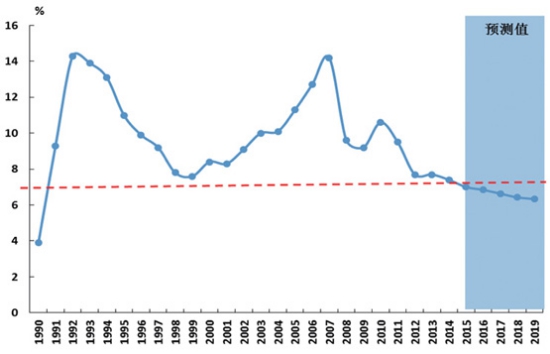 圖3 布倫特原油現(xiàn)貨價(jià)格 3. 技術(shù)孕育新突破,世界經(jīng)貿(mào)構(gòu)筑新格局。 自身發(fā)展規(guī)律和全球經(jīng)濟(jì)調(diào)整都揭示出未來(lái)將取得重大技術(shù)突破。從重大技術(shù)突破自身規(guī)律看,當(dāng)前正處于孕育期,盡管突破的核心技術(shù)難以預(yù)測(cè),但可以看到信息化、能源和人工智能以及以美國(guó)為代表的生物醫(yī)藥技術(shù),都可以作為孕育突破的溫床。身邊就可以看到的是互聯(lián)網(wǎng)正逐步改變著企業(yè)經(jīng)營(yíng)和人們的生活消費(fèi),突破了以往的商業(yè)模式。 技術(shù)經(jīng)濟(jì)對(duì)比變化和各國(guó)戰(zhàn)略調(diào)整,推動(dòng)形成新的經(jīng)貿(mào)格局。為有效應(yīng)對(duì)經(jīng)濟(jì)發(fā)展和全球氣候變化面臨的新問(wèn)題,發(fā)達(dá)國(guó)家依托技術(shù)優(yōu)勢(shì),促使經(jīng)濟(jì)逐步復(fù)蘇,并成為世界經(jīng)濟(jì)增長(zhǎng)的主要?jiǎng)恿。美?guó)重振制造業(yè)和德國(guó)工業(yè)4.0代表著西方國(guó)家的制造業(yè)開(kāi)始重新展現(xiàn)出新的活力,成為經(jīng)濟(jì)復(fù)蘇的重要?jiǎng)恿,同時(shí)以歐盟為代表的發(fā)達(dá)國(guó)家依托節(jié)能減排技術(shù)優(yōu)勢(shì),大力推動(dòng)低碳發(fā)展和碳交易,也在重塑世界制造業(yè)貿(mào)易格局,帶動(dòng)發(fā)達(dá)國(guó)家重回世界引擎地位。發(fā)展中實(shí)體之間經(jīng)濟(jì)增長(zhǎng)也開(kāi)始出現(xiàn)差異,金磚國(guó)家之間分化明顯,預(yù)計(jì)“十三五”期印度經(jīng)濟(jì)年均增速約為6.5%,而巴西、俄羅斯分別降為2.7%和1.8%。世界經(jīng)濟(jì)力量、技術(shù)力量對(duì)比的變化,加之地緣政治和各國(guó)戰(zhàn)略的調(diào)整,正在推動(dòng)全球形成新的經(jīng)貿(mào)格局,為適應(yīng)這種變化,美國(guó)通過(guò)主導(dǎo)的TPP、TTIP意在構(gòu)筑國(guó)際貿(mào)易的新規(guī)則 TPP,與此相對(duì)應(yīng),我國(guó)也通過(guò)全面推進(jìn)自由貿(mào)易區(qū)和“一帶一路”戰(zhàn)略,來(lái)適應(yīng)國(guó)際形勢(shì)變化,調(diào)整國(guó)家戰(zhàn)略。 “十三五”我國(guó)經(jīng)貿(mào)發(fā)展特點(diǎn) 1.我國(guó)經(jīng)濟(jì)轉(zhuǎn)向中速增長(zhǎng)階段,經(jīng)濟(jì)結(jié)構(gòu)發(fā)生轉(zhuǎn)折性變化。 經(jīng)濟(jì)進(jìn)入中速增長(zhǎng)階段。圖5顯示了1990年以來(lái)我國(guó)經(jīng)濟(jì)增速的變化。2000-2010年我國(guó)經(jīng)濟(jì)、對(duì)外貿(mào)易分別保持了年均10.5%和20.2%的增長(zhǎng),2010年后呈現(xiàn)逐步放緩態(tài)勢(shì),2014年降為7.4%。當(dāng)前,我國(guó)經(jīng)貿(mào)發(fā)展面臨十分復(fù)雜的國(guó)際環(huán)境,內(nèi)部則處于“三期”疊加期。隨著新型工業(yè)化、信息化、農(nóng)業(yè)現(xiàn)代化和城鎮(zhèn)化“新四化”的不斷推進(jìn),以及市場(chǎng)機(jī)遇、投資機(jī)遇、綠色機(jī)遇和對(duì)外合作機(jī)遇的不斷擴(kuò)大,為我國(guó)經(jīng)濟(jì)增長(zhǎng)提供了巨大潛力和回旋空間。這些發(fā)展環(huán)境變化使我國(guó)經(jīng)濟(jì)發(fā)展進(jìn)入新常態(tài),預(yù)計(jì)2015年GDP增長(zhǎng)約7%,“十三五”期間經(jīng)濟(jì)平均增速只要保持在6.6%(如圖5所示),即可實(shí)現(xiàn) 2020年GDP總量比2010年翻一番的戰(zhàn)略目標(biāo),按照人均GDP水平測(cè)算,我國(guó)將進(jìn)入高收入國(guó)家行列,對(duì)海運(yùn)需求質(zhì)量將全面提高。