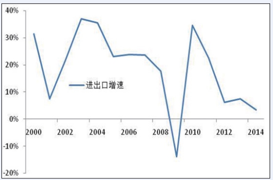 圖7 沿海地區(qū)(含北京)占全國(guó)GDP比重 2.對(duì)外貿(mào)易彈性下降,貿(mào)易伙伴多元化。 外貿(mào)保持穩(wěn)定增長(zhǎng),與經(jīng)濟(jì)彈性進(jìn)一步下降。在加入WTO的帶動(dòng)下,2000-2007年我國(guó)外貿(mào)進(jìn)出口總額保持了24.3%的年均增長(zhǎng)(如圖8所示),與 GDP的彈性系數(shù)高達(dá)2.25,明顯高出世界1.5的平均水平,成為世界重要經(jīng)貿(mào)大國(guó)。受到金融危機(jī)沖擊和全球貿(mào)易放緩的影響,面對(duì)國(guó)內(nèi)外復(fù)雜形勢(shì),2007-2014年我國(guó)對(duì)外貿(mào)易仍保持較快發(fā)展,外貿(mào)進(jìn)出口總額年均增速達(dá)到10.2%,國(guó)際貿(mào)易地位不斷提高,成為世界第一貨物貿(mào)易大國(guó)。隨著貿(mào)易依賴(lài)度的提高,進(jìn)出口彈性逐步下降,由2.25下降為1.16!笆濉逼陂g我國(guó)對(duì)外貿(mào)易發(fā)展將面臨更加復(fù)雜的國(guó)際環(huán)境,將逐步轉(zhuǎn)入平穩(wěn)發(fā)展階段,與 GDP的彈性下降為1.0,外貿(mào)進(jìn)出口總額增速保持在6.6%與GDP相當(dāng)?shù)乃健?BR> 貿(mào)易區(qū)域結(jié)構(gòu)不斷優(yōu)化,貿(mào)易伙伴保持多元化趨勢(shì)。隨著我國(guó)經(jīng)濟(jì)社會(huì)發(fā)展水平的提高,貿(mào)易呈現(xiàn)多元化發(fā)展趨勢(shì),特別是金融危機(jī)后,亞洲、歐洲和北美洲占貿(mào)易比重由2007年的89.6%逐步降為2014年的85.1%,美國(guó)、歐盟和日本所占比重由41.1%降為34.4%,而非洲、拉丁美洲所占貿(mào)易比重則由 8.1%上升為11.3%。隨著世界貿(mào)易格局的調(diào)整,以及我國(guó)“一帶一路”戰(zhàn)略的推進(jìn),對(duì)外貿(mào)易結(jié)構(gòu)將進(jìn)一步優(yōu)化,與東盟、非洲等海上絲綢之路沿線(xiàn)國(guó)家貿(mào)易比重進(jìn)一步上升。