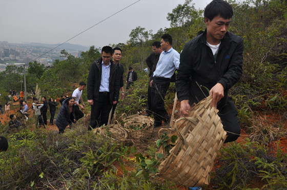 在莊山公園種花現(xiàn)場,大家熱情高漲,干勁十足,相互配合,將一筐筐杜鵑花幼苗手提肩扛到半山腰,揮鋤挖土填坑、插種花苗、踏實(shí)土層,一棵棵杜鵑花苗落地生根。經(jīng)過一個多小時努力,大家共種植下花苗近千株。這些杜鵑花長成后將會是莊山公園里那一片美麗的花海。